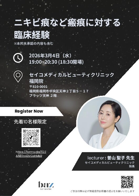 【セミナー概要】 日時:2026年3月4日(水)19:00-21:00 (18:30 受付開始) 場所:セイコメディカルビューティークリニック福岡院 講師:曽山 聖子院長